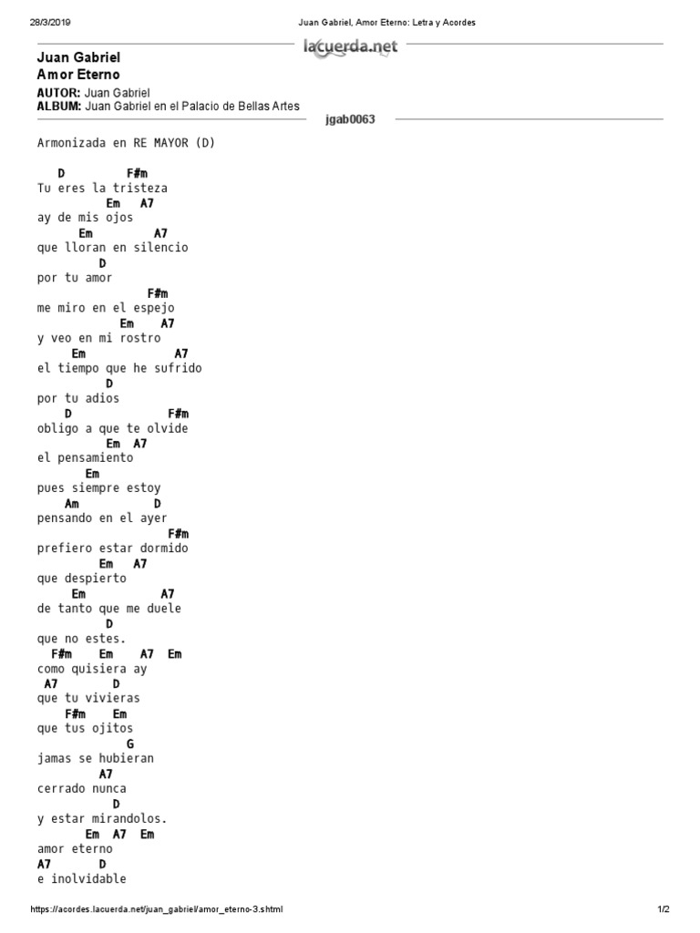 Me miro en el espejo y veo en mi rostro, el tiempo que he sufrido por tu adiós. Amor eterno (en vivo) (en el palacio de bellas artes). Dónde que quiera que esté lo amaremos hasta la eternidad. Tú eres la tristeza de mis ojos, que lloran en silencio por tu amor. Yo he sufrido tanto por tu ausencia, desde se da hasta hoy, no soy feliz. Www.angelovoz.com www.myspace.com/angelovoz www.facebook.com/angelovoz www.vimeo.com/angelovoz www.twitter.com/angelo_twiter… Yo he sufrido tanto por tu ausencia, desde se da hasta hoy, no. Amor eterno eterno amor eterno eterno. Juan miguel & luis gabriel. Letras, acordes y tabs para guitarra, bajo y ukulele. Yo he sufrido tanto por tu ausencia, desde se da hasta hoy, no. Ver más ideas sobre juan gabriel amor eterno, gabriel, el divo. Me miro en el espejo y veo en mi rostro el tiempo que amor eterno, e inolvidable.